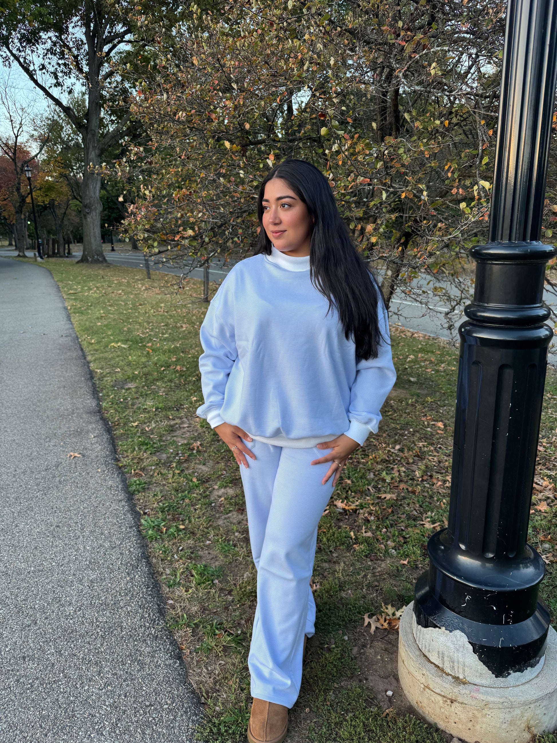 The softest material with a blend of cotton, polyester, and some snow! This cold cutie is an oversized fit with a mock neck style neckline. It is giving winter romance and we are here for it! The style is so cute and so trend! We can't wait to wear it on our snow days!