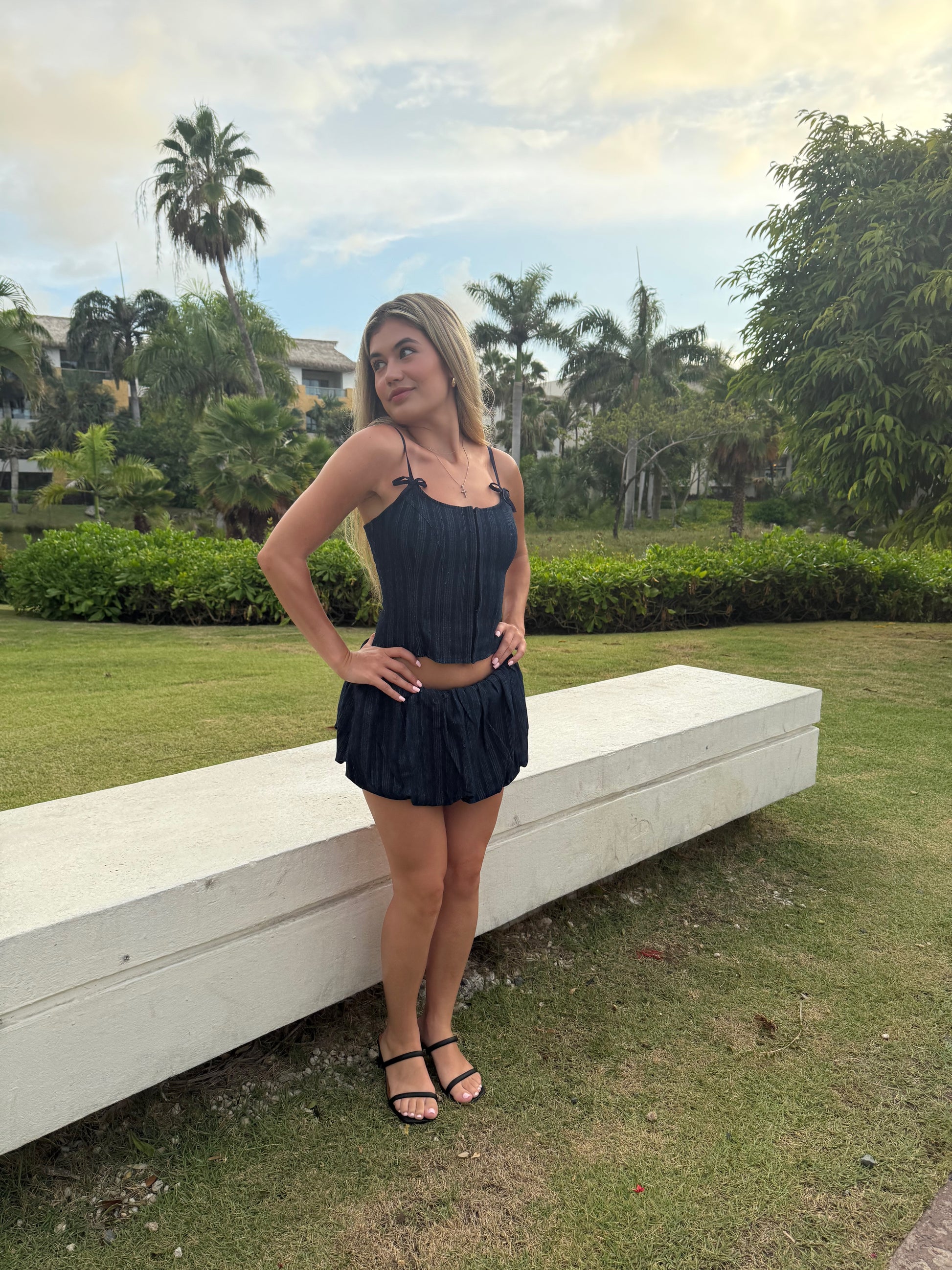 The Manon Striped Denim skirt matches the Manon corset top so perfectly. The skirt is a bubble style with comfortable built in shorts. The skirt adds a very chic and edgy look to your outfit. It is a perfect look for a summer day with the girls!