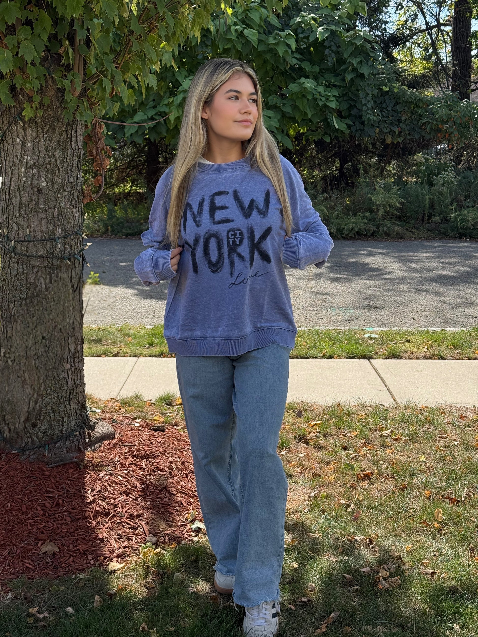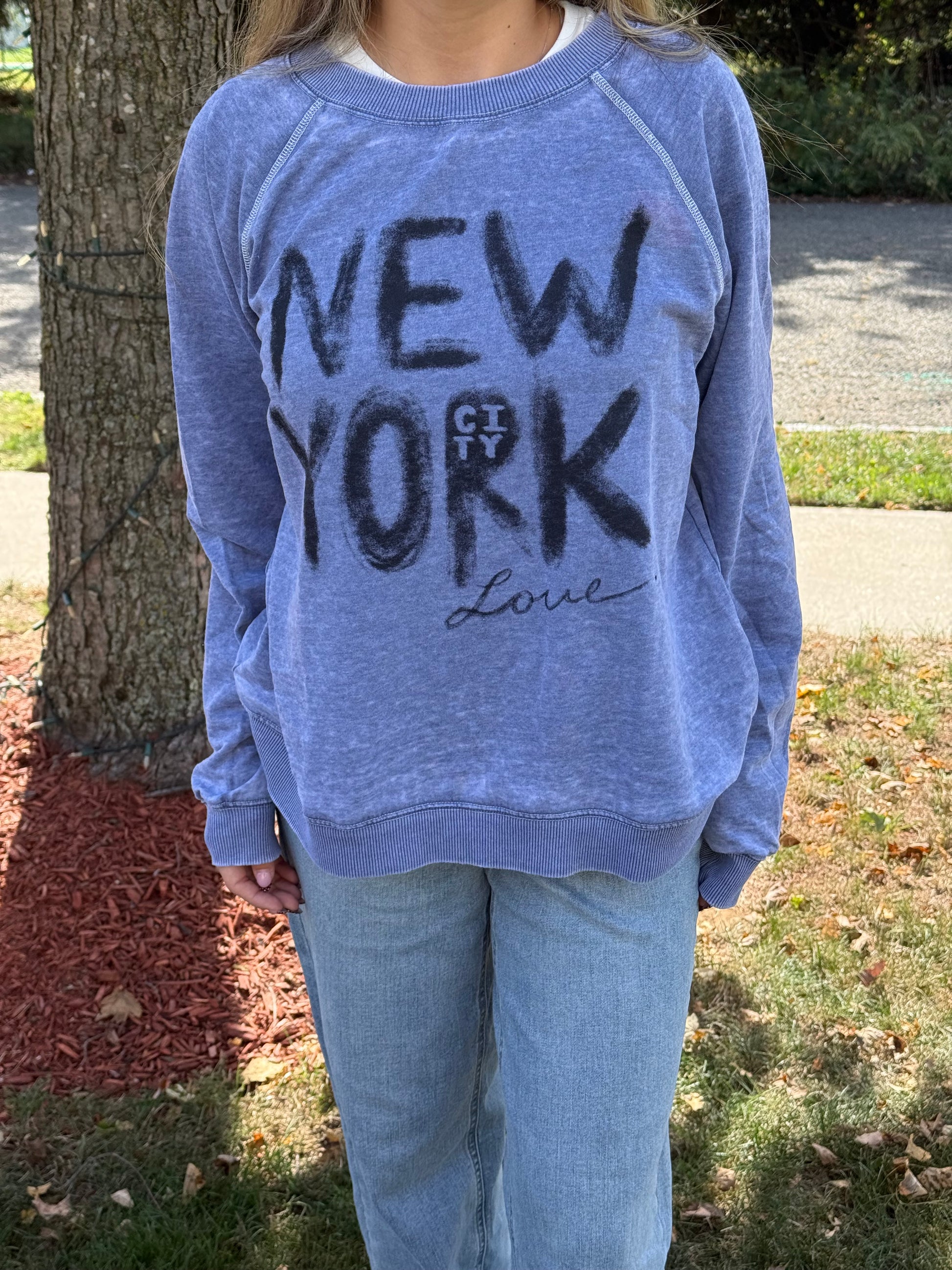 Showing NYC some love with our loose fitting crewneck sweater. Featuring a graphic print of "NEW YORK" showing comfort with our iconic style. It is a vintage blue crewneck that has an oversized fit giving you comfort and edge.